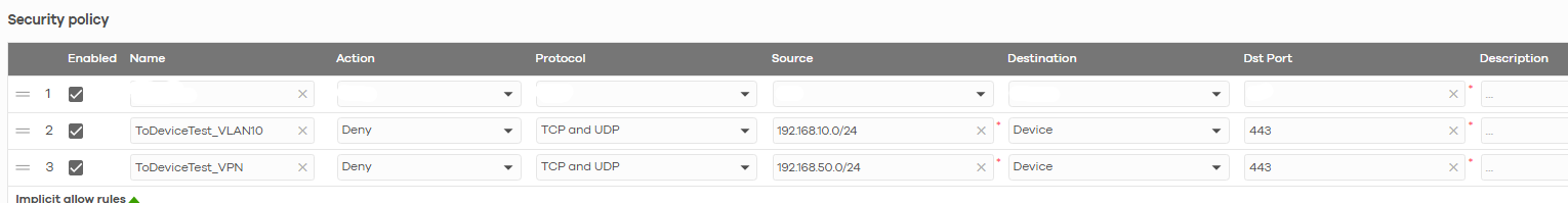 Please note that for this rule, it is important to specify the correct port since selecting "Any" will block all traffic from that segment to the device. As shown in the image above for Protocol 443 (USG LITE 60AX web GUI port), this blocks segment IPs from accessing the web interface.