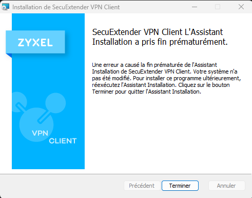 I understand you're encountering an error during the installation of SecuExtender VPN Client version 7.7.50.008, where the installation ends prematurely. This typically indicates an underlying system or software conflict.