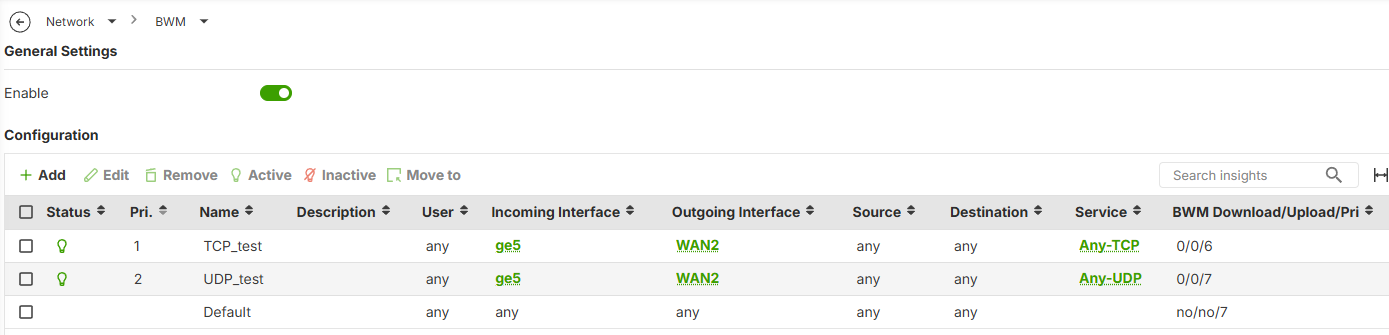 Incoming Interface(ge5) andOutgoing Interface(WAN2) specified in your BWM rules accurately reflect your network topology and the traffic path you intend to manage. - For the "BWM Download/Upload/Pri" column, ensure that the priority values (6 for TCP, 7 for UDP) are correctly entered and that these priorities are within the valid range for your device. A lower number generally indicates higher priority.