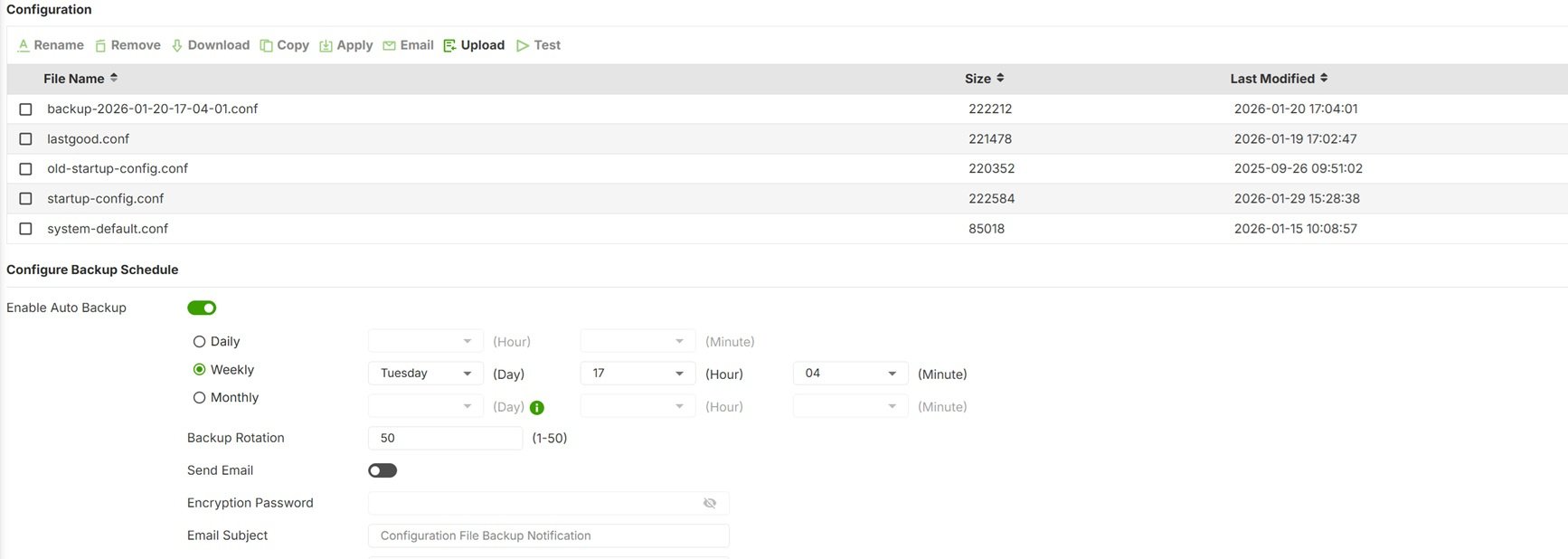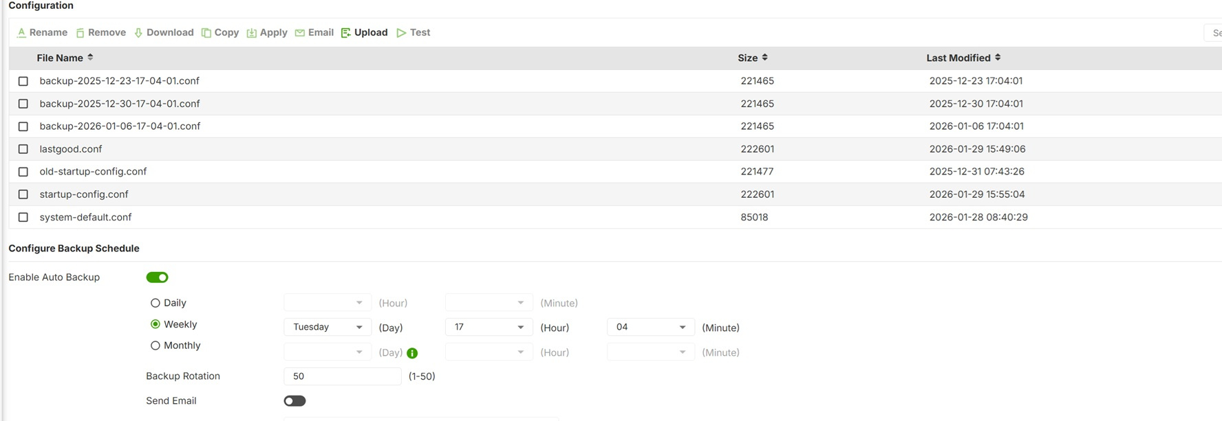 - Backup Settings: Details of your configuration backup settings (e.g., auto-backup interval, backup rotation limit if configured, number of backup files allowed).