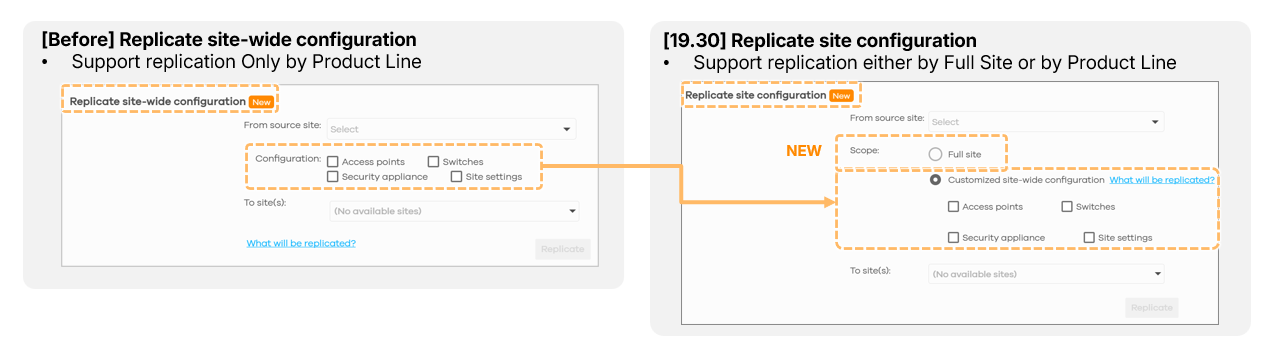 The replication tool has been upgraded from supporting only product-line specific copying to expanding Full Site Replication. This tool allows users to copy a configuration from a source site and apply it to multiple destination sites within the same Nebula organization.