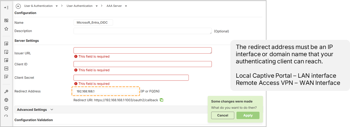 - Redirect URI: Must be set to the WAN IP or public FQDN of the firewall so remote clients can finalize authentication.