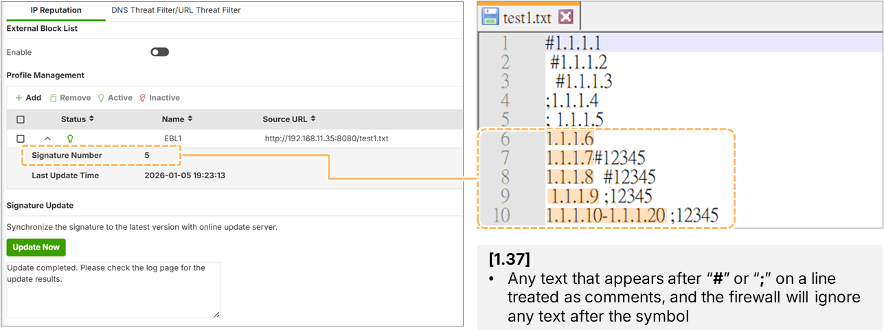 Firmware version 1.37 introduces a critical improvement for importing external block lists. Previously, users encountered parsing errors when attempting to import lists containing comment symbols, such as the number sign (#) or the semicolon (;). The firewall would fail to recognize these as comments and attempt to process them as invalid IP data.