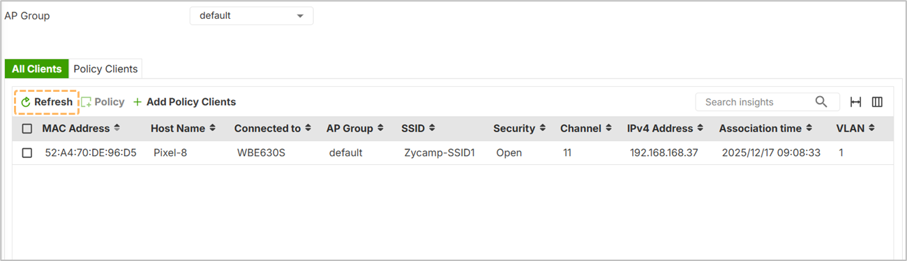 - All Clients List: This allows for the immediate viewing of newly connected wireless clients.