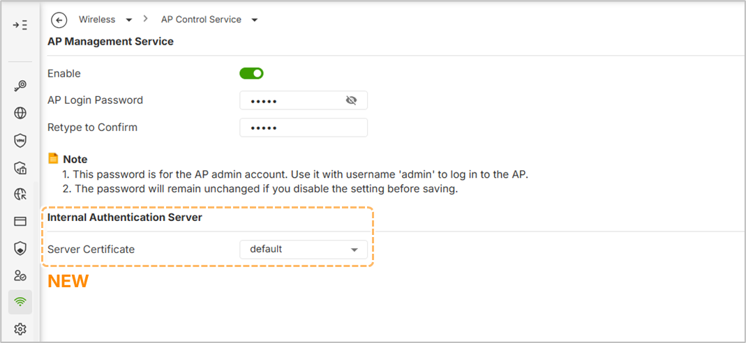 Administrators now have the ability to manually select the Server Certificate for the internal authentication server within the AP Management service. This feature allows for the use of custom certificates for wireless clients using WPA Enterprise, specifically when EAP Proxy is disabled.