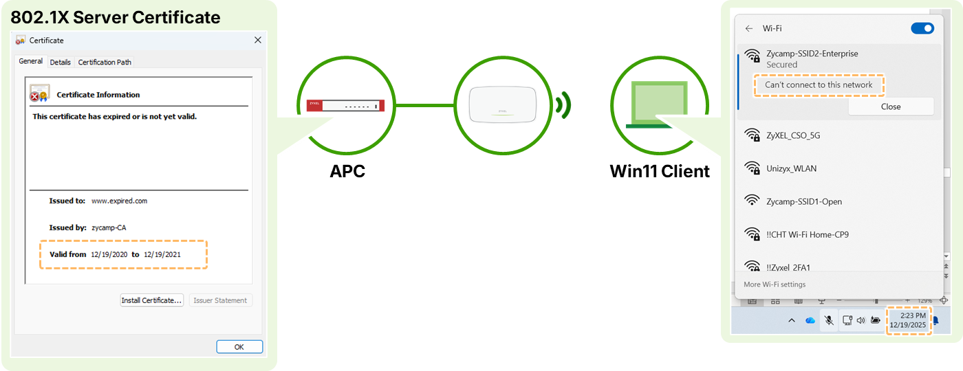 This update provides a workaround for historical issues where default certificates had short validity periods, leading to authentication failures. Modern operating systems like Windows 11 are known to reject expired 802.1X server certificates, causing connection failures for WPA Enterprise users. While certificates can be selected, it is important to note that version 1.37 does not support EAP-TLS for client authentication on the internal server.