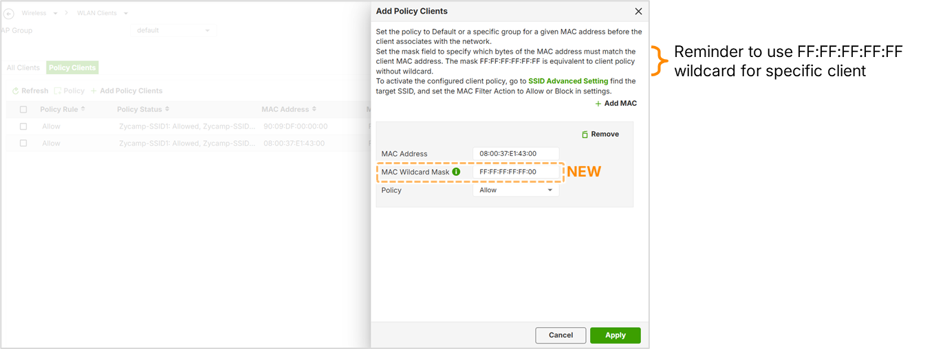 Client policies now support MAC address wildcards, allowing administrators to create broad rules for groups of devices based on their Organization Unique Identifier (OUI).
