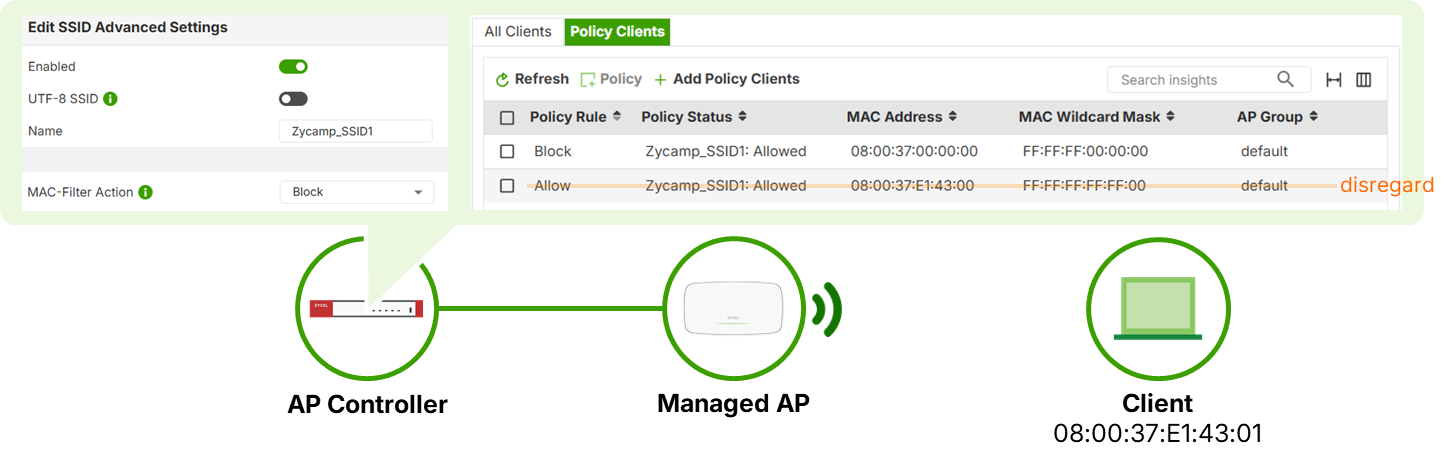 When overlapping policies exist, the SSID Mac Filter Action (Allow or Block) dictates the outcome. If the SSID is set to "Block," the firewall will ignore any "Allow" policies for matching clients, prioritizing the block list.