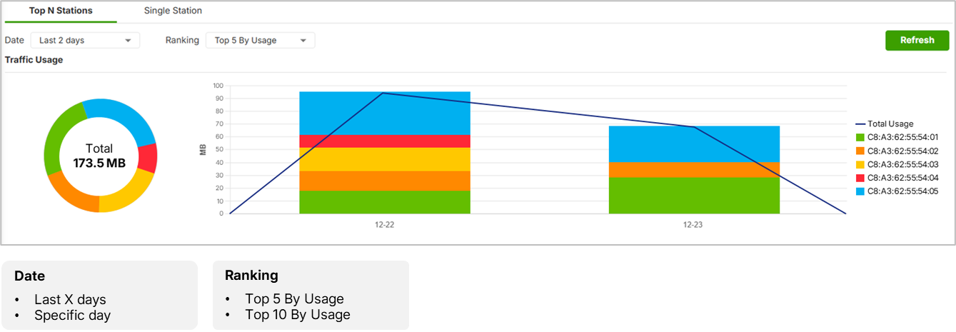 - Top-N Stations with Last 2 Days: Graphs identify the top 5 users based on bandwidth usage.