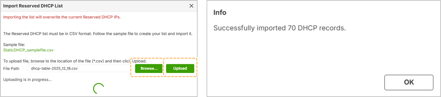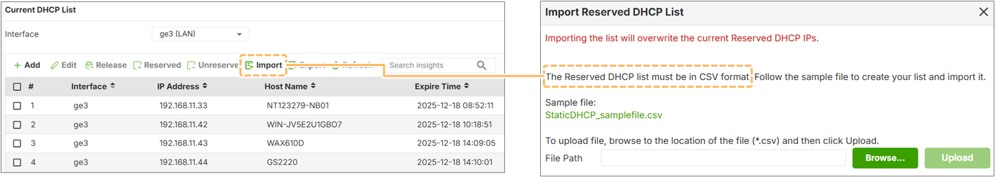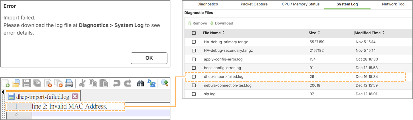 When migrating from ZLD, users must edit the ZLD CSV to change interface names (e.g., LAN1 to GE1) and update the "reserve" column to the "status" column using the keyword "reserved". If an import contains errors, invalid entries are ignored while valid ones are successfully imported. Detailed error logs can be found in the Diagnostics section under system logs.Success imported DHCP recoreds: