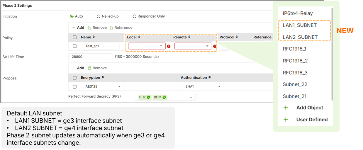 Zyxel has introduced fixed objects for LAN1 and LAN2 subnets in VPN Phase 2 configurations. These objects are permanent references to the GE3 and GE4 interfaces.