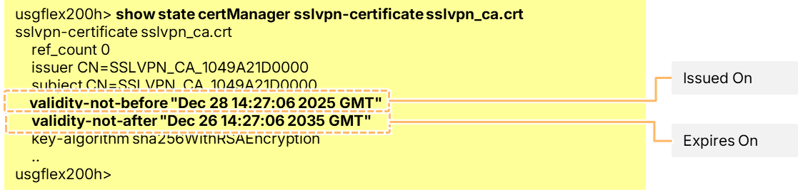 The expiration date is now displayed within the SSL VPN settings in the web GUI. Administrators can also verify the certificate status via the CLI using the show state cert-manager command. Monitoring this date is crucial, as an expired certificate requires the generation of a new certificate and a re-provisioning of the configuration file to all remote clients.