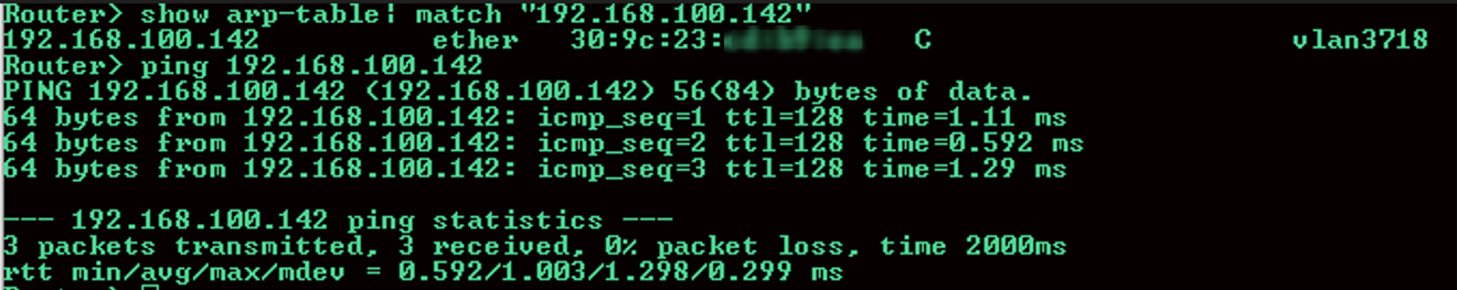 "The user can use the CLI command show arp-table | match "192.168.100.142" and then ping it to check whether the static DHCP IP 192.168.100.142 is working