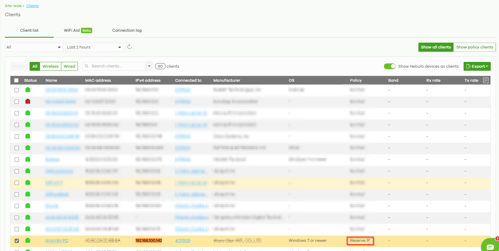 The user can navigate to Site-wide > Clients to check whether 192.168.100.142 has already been reserved as an IP.