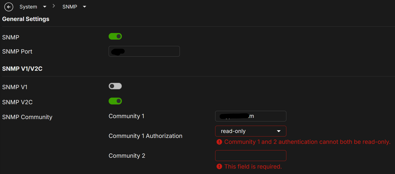 Now seems that I've obligated to create 2 community (both community 1 and 2 are required) and also I cannot create 2 community read-only (because only 1 community at time can be read-only).