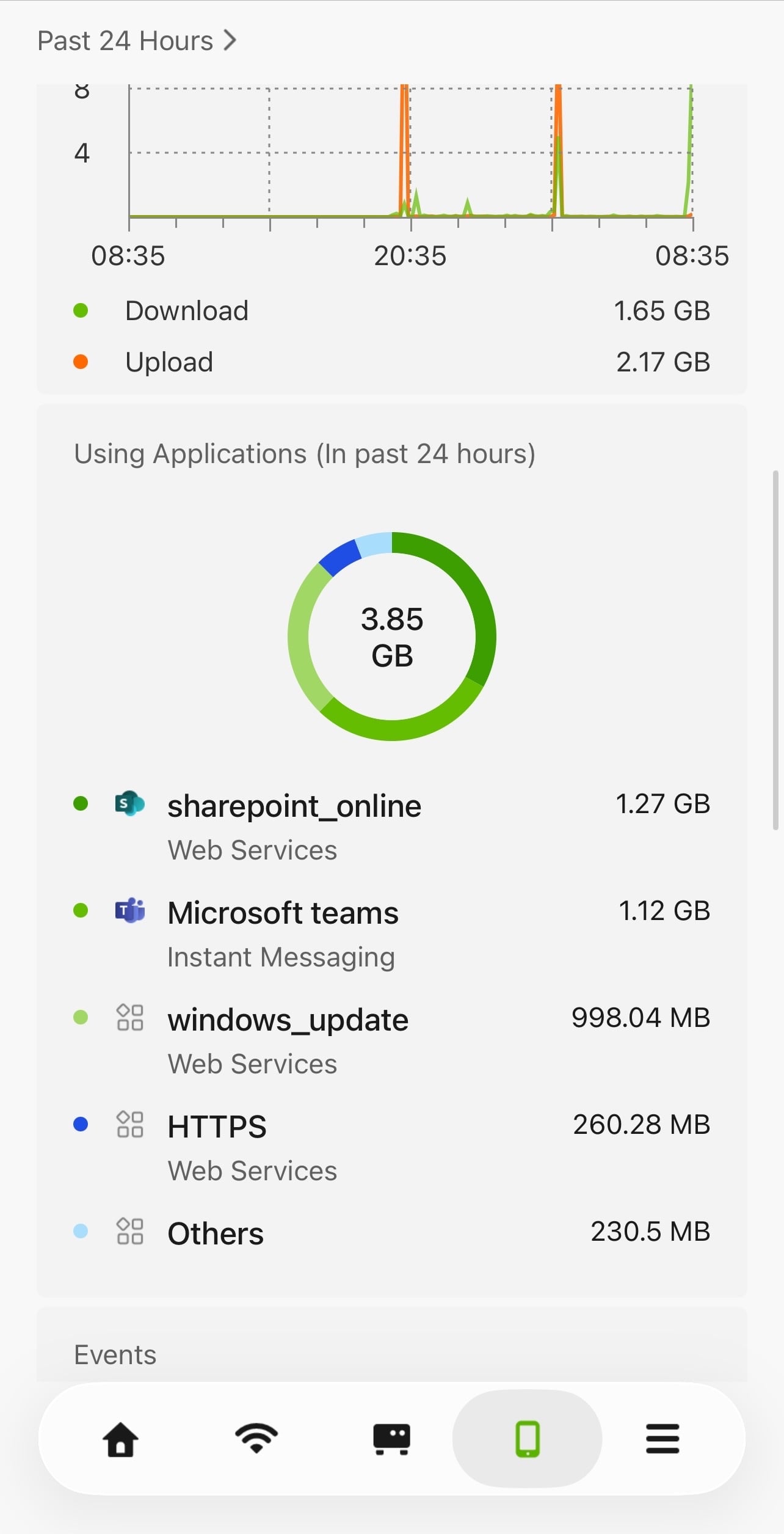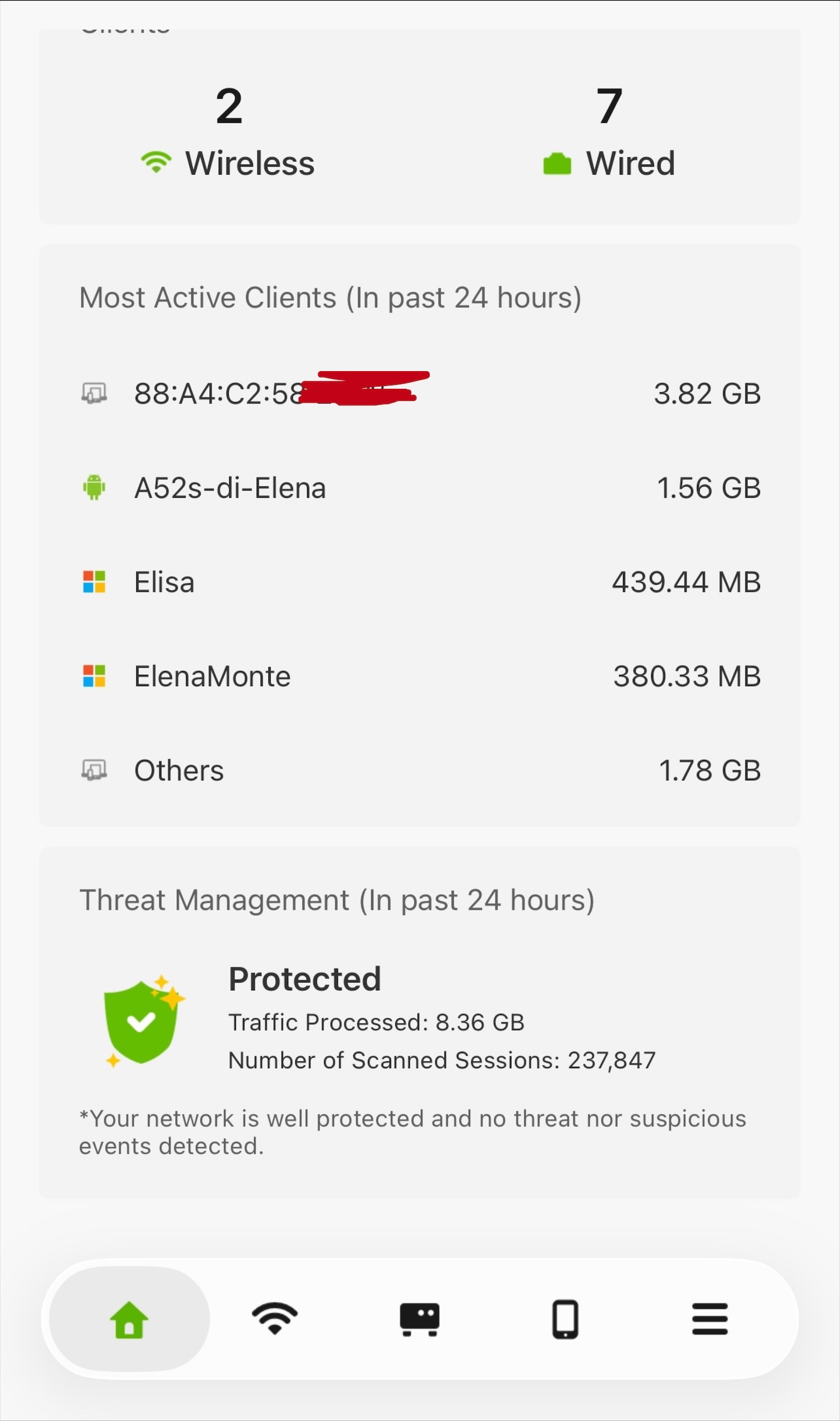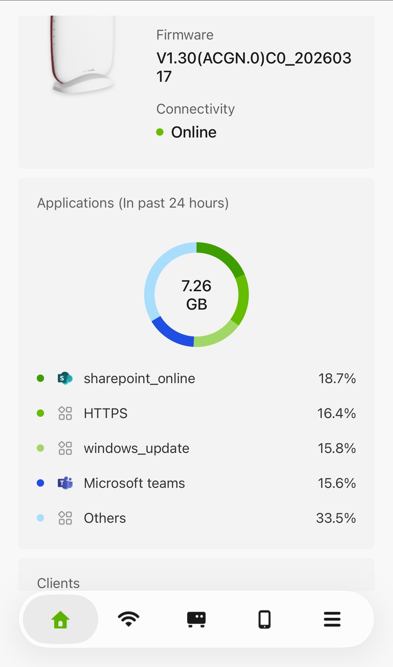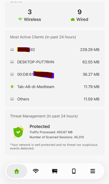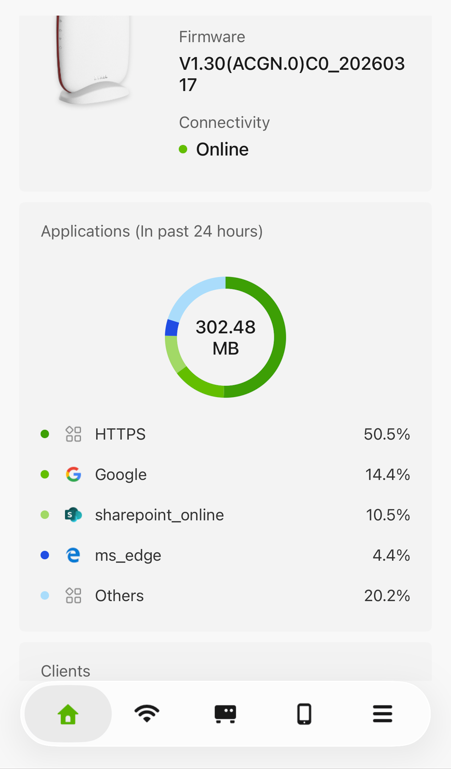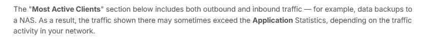 The "Most Active Clients" section below includes both outbound and inbound traffic — for example, data backups to a NAS. As a result, the traffic shown there may sometimes exceed the Application Statistics, depending on the traffic activity in your network.