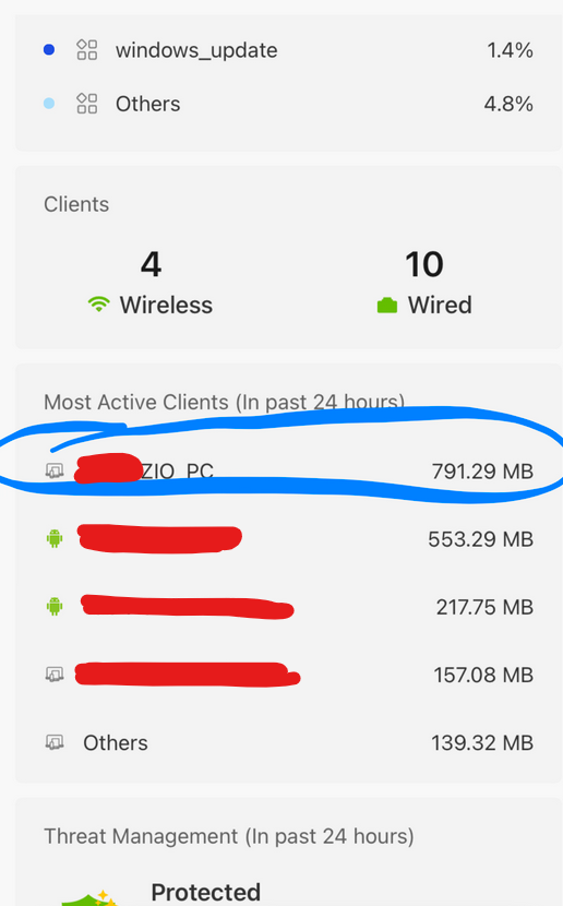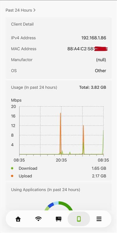 When clicking into the most active client (88:A4:C2:58:xx:xx, for example), the download and upload usage appears to be consistent with its application usage.