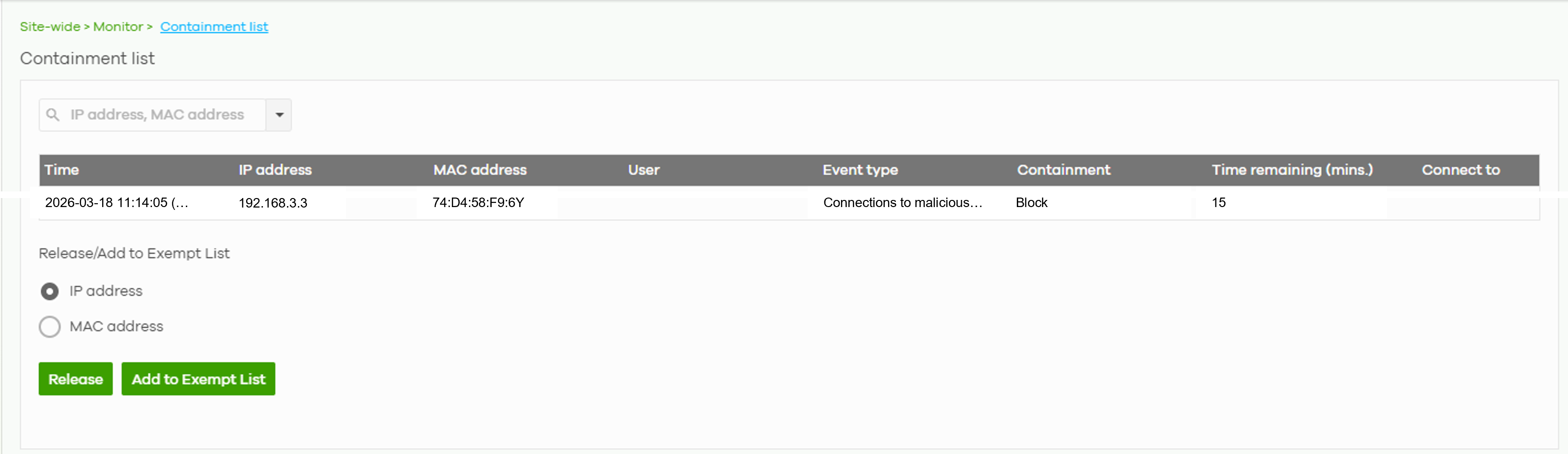 While the response is automated, the MSP retains absolute oversight. Within the NCC, the Containment List (Site-wide > Monitor > Containment list) serves as the centralized dashboard for all restricted devices.