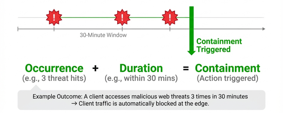 One of the greatest contributors to staff turnover in SOC environments is alert fatigue. CDR combats this through a rule-based policy engine that uses "Occurrence" and "Duration" logic. For example, an MSP admin can configure a policy that only quarantines a device if it exceeds a threat threshold 3 times within a 30-minute window.