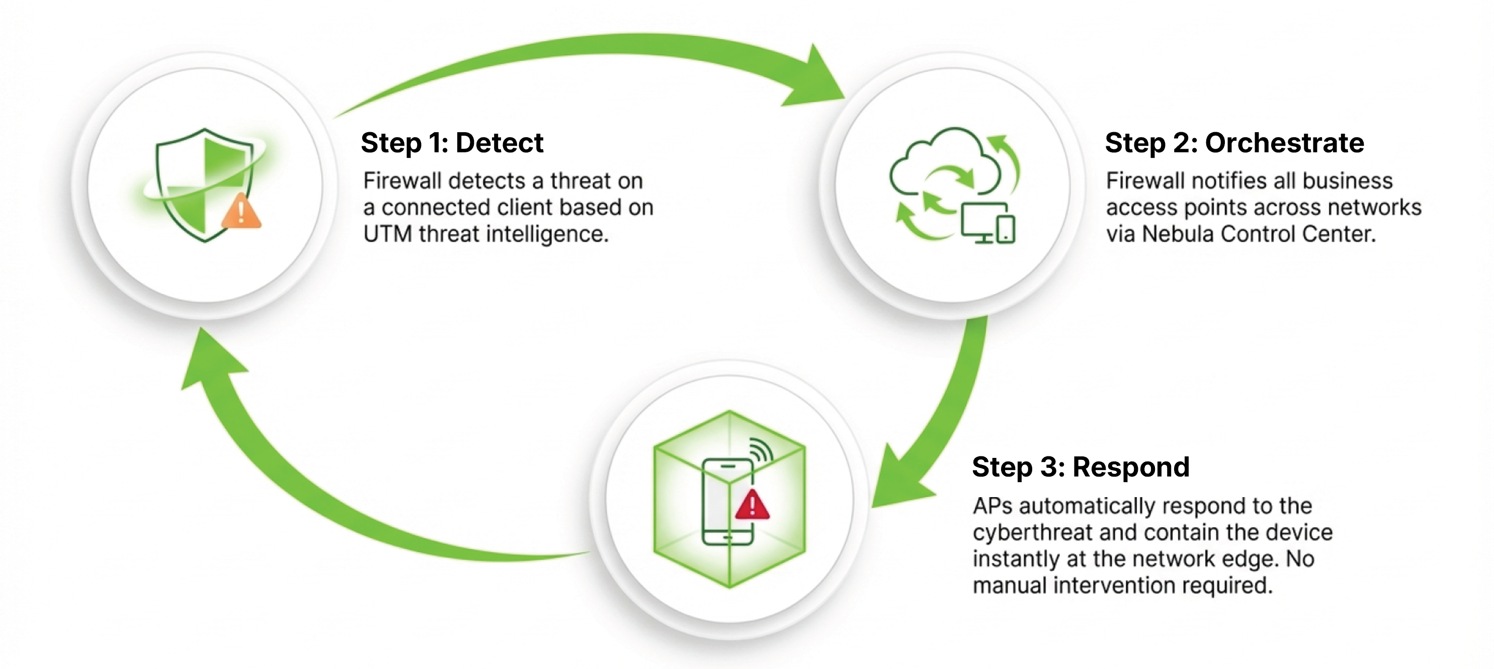 Collaborative Detection & Response (CDR) integrates Nebula firewalls and Nebula access points(APs) to deliver automated threat responses and mitigate risks. It transforms a collection of isolated hardware into a responsive, defensive ecosystem capable of containing threats at the moment of discovery—right at the network edge.