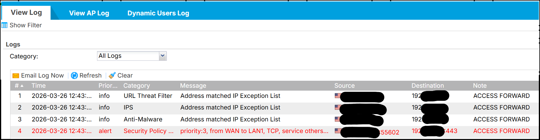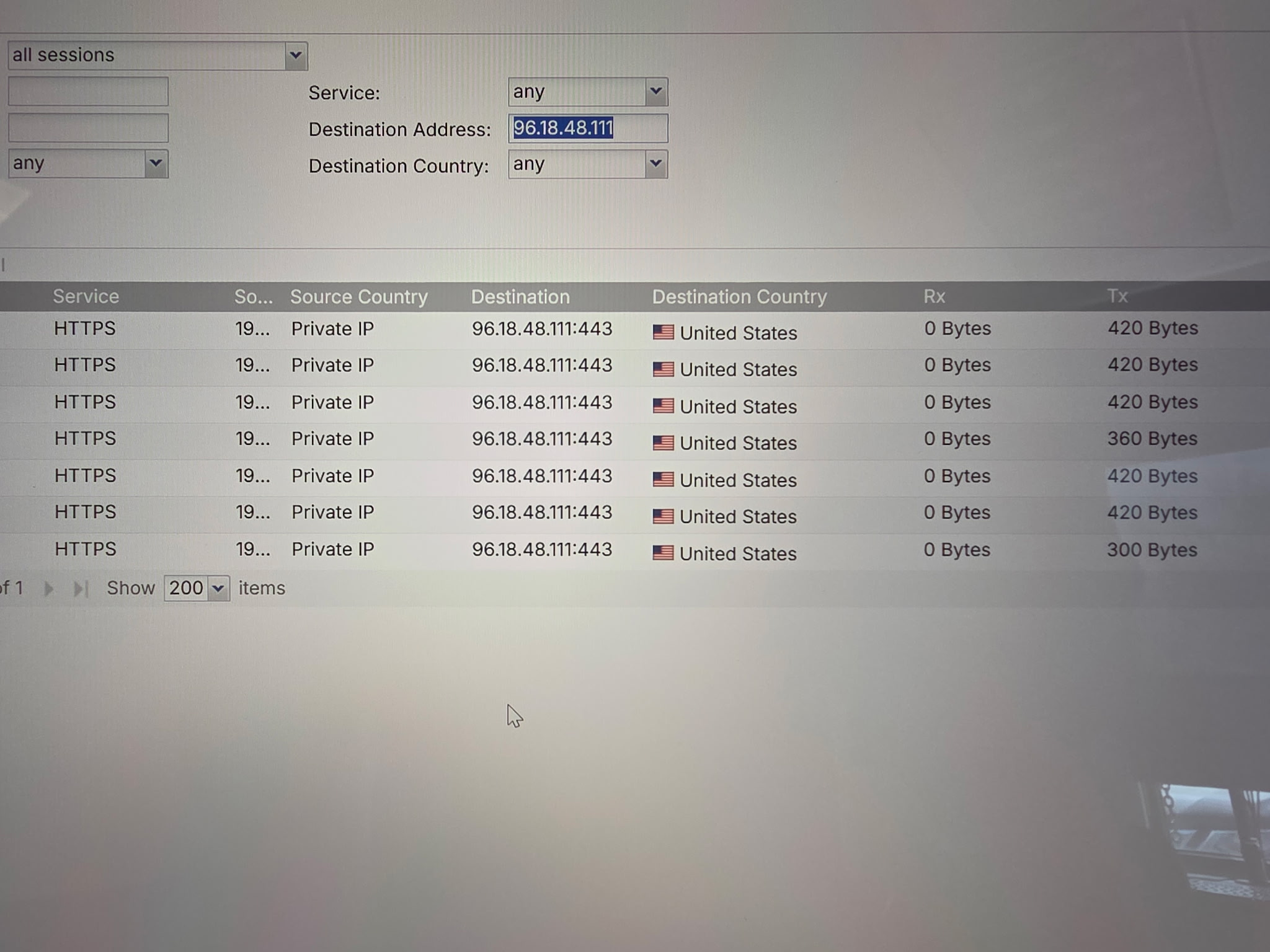 I'm waiting for the user to try to connect again so I can get a screenshot. I'll post an update when I get it.I checked, and actually in the session monitor log it did show up while the user was trying to connect, and it did have both tx and rx data, but very little and then it disappeared after failing to connect. But I do have the monitor log that shows that it was forwarded through and not blocked, but still would not connect.