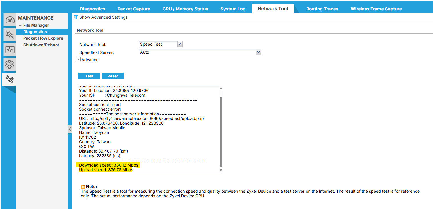 Additionally, please note that the USG FLEX 500 has a built-in speed test tool. To use it, navigate to Maintenance > Diagnostics > Network Tool, select Speed Test, run the test, and share a screenshot of the results with us.