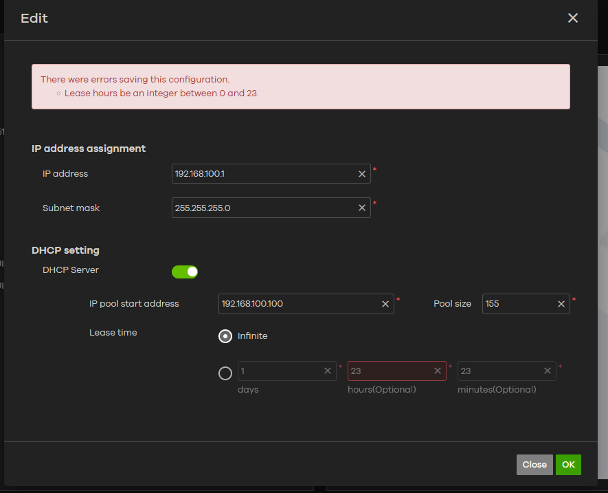 The customer reported an issue when configuring the FWA510 LAN settings in Nebula, as the lease time setting kept failing regardless of the value entered. We confirmed the issue was identified and a fix was scheduled for release next Tuesday. As a workaround, for anyone encountering the same problem, please configure the settings via the local GUI. As long as no changes are made on NCC, it will not push settings down to overwrite the local configuration, and any IP settings on NCC will not be synced from the local side.