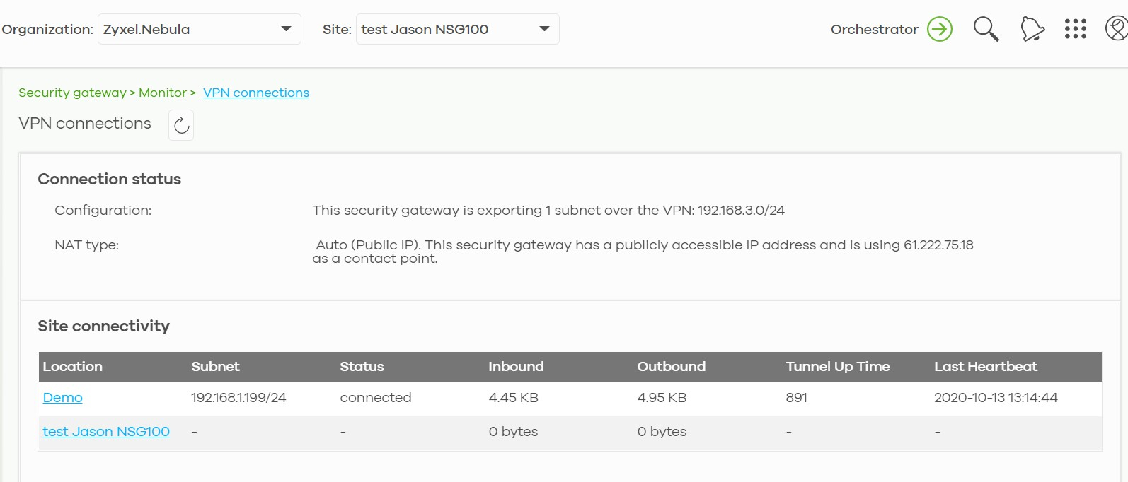 On Zyxel.Nebula/test Jason NSG100, go to Security gateway > Monitor > VPN connection