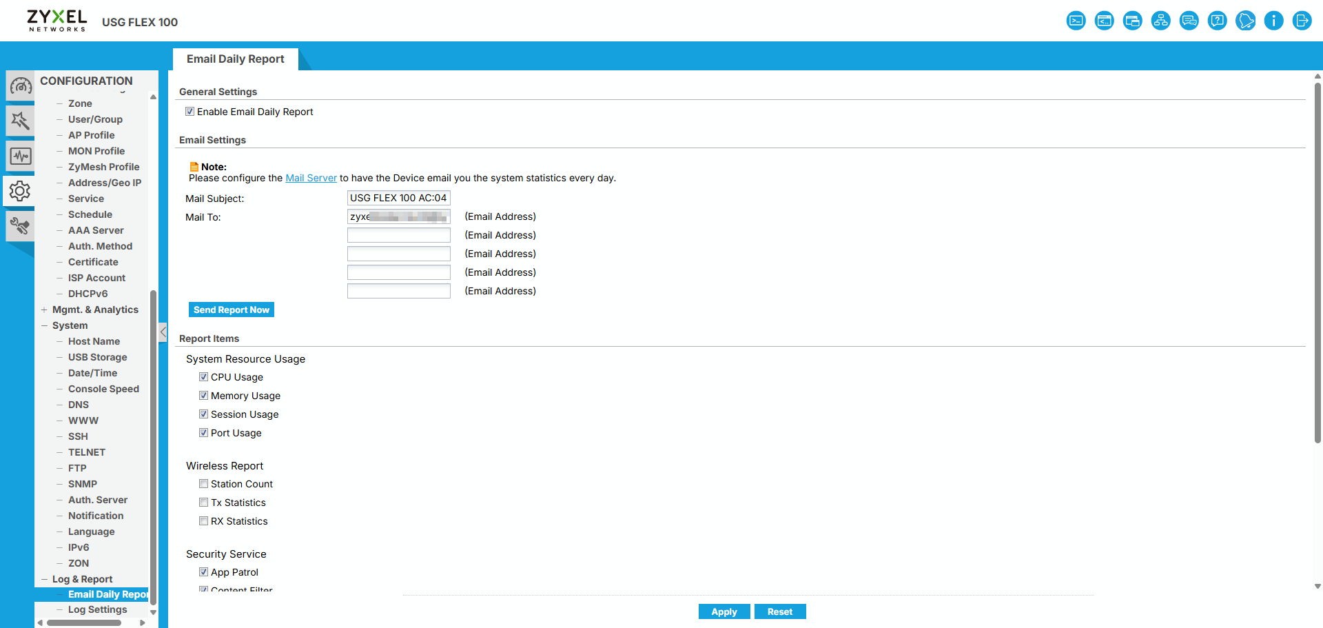 Step 1: Go to Configuration > Log & Report > E-mail Daily Report > Select the Enable Email Daily Report checkbox > Enter the necessary info of Email Settings/Schedule/Report Item > Click on Apply
