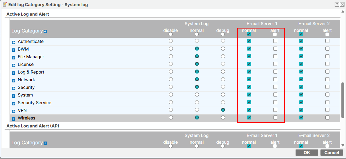 Step 2: Select Active checkbox > Enter the necessary info of Email/Log > Select the log category you want to receive > Click OK button