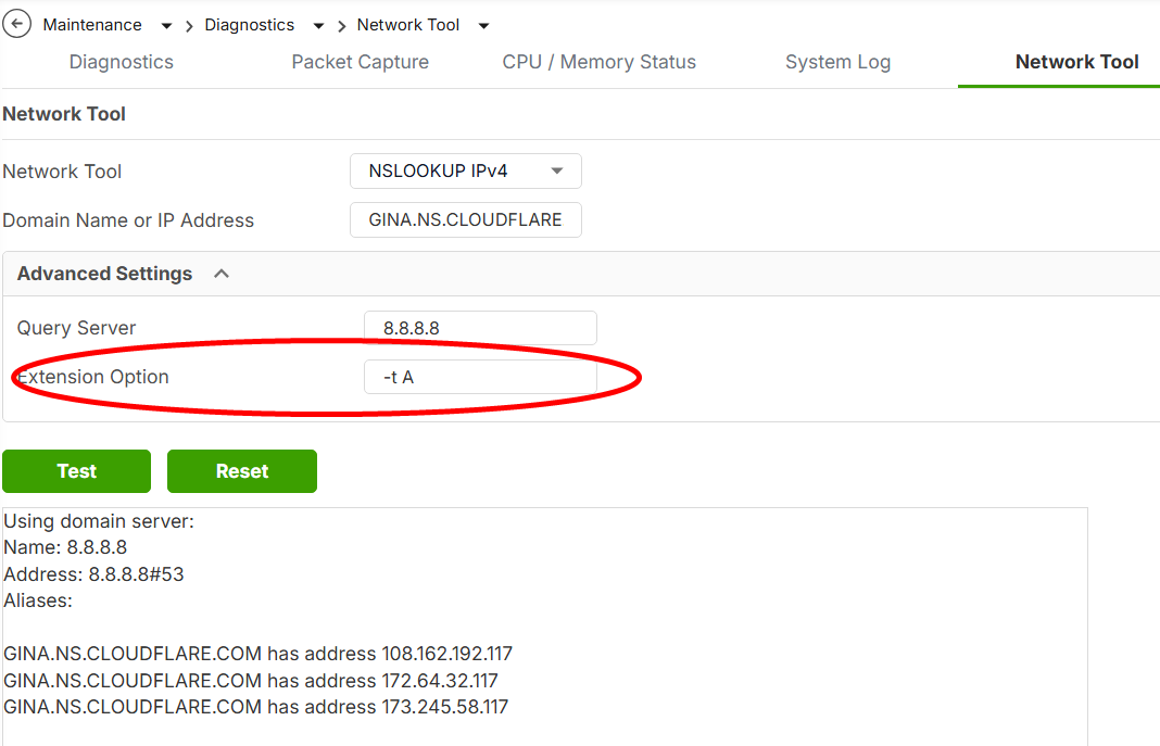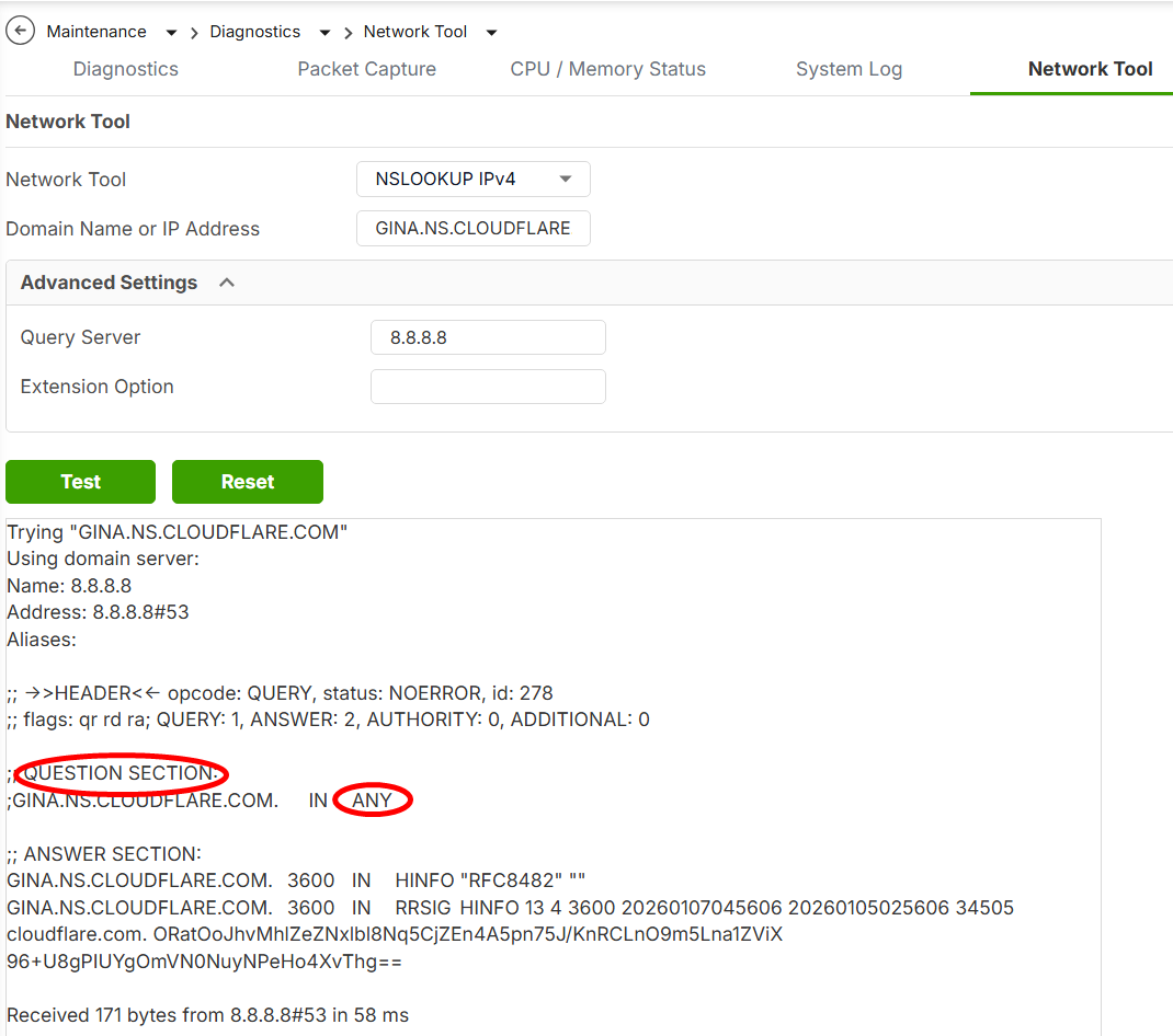 -The test functions on the USG sending ANY query by default, causing the FQDN object to not populate the IP after creating it and using the 'Test' function to test it, which occurs when the DNS provider is enforcing RFC8482.