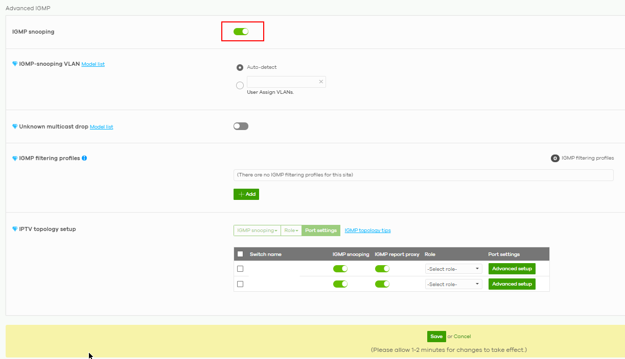 前往【整個站點 > 設定 > 交換器 > IGMP進階設定】啟用該頁面最上方的「IGMP snooping」,完成記得點選「Save」。
