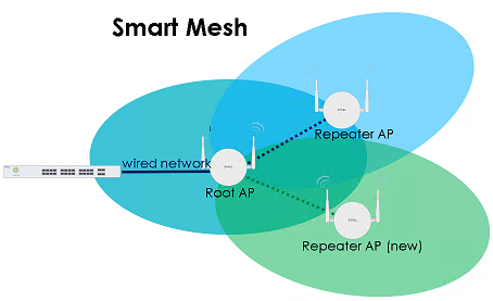 - Smart Mesh是透過指定單一存取點(稱為「Root AP」)來維持與主網路基礎設施的有線連接以及透過無線連接到「Root AP」的「Repeatter AP」來運作。
