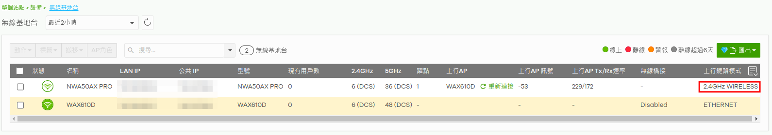 - 確認 AP 已套用最新設定:整個站點 > 設備 > 無線基地台