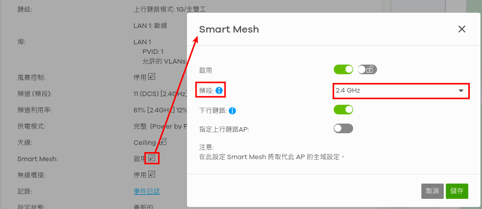 - 啟用Smart Mesh : 設定 > 無線基地台 > AP及網路埠設定