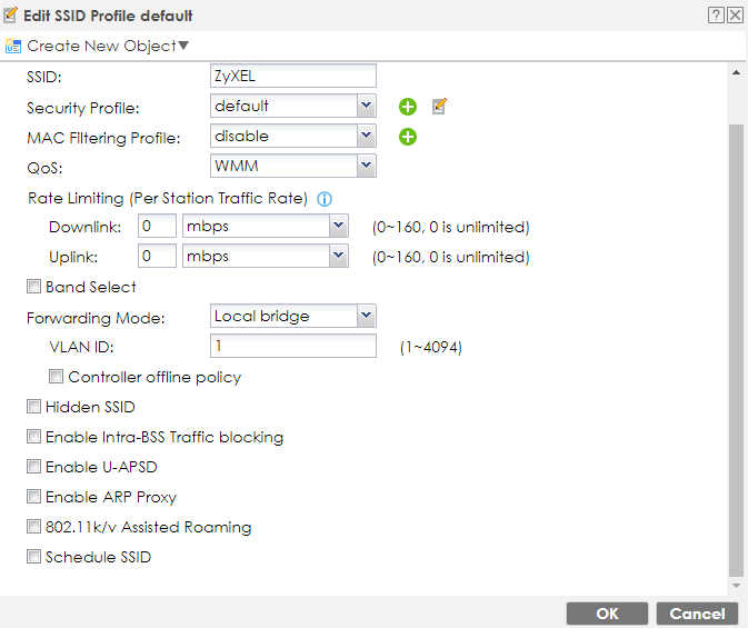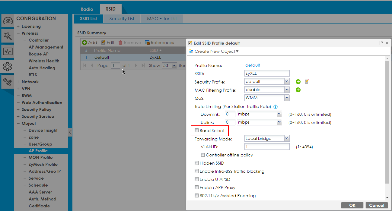 Configuration -> Object -> AP Profile -> SSID -> SSID List -> Add/Edit SSID Profile
