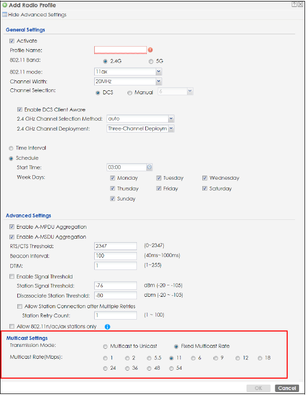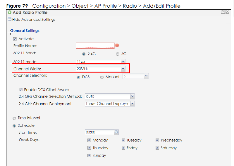 前往 Configuration -> Object -> AP Profile -> Radio -> Add/Edit Profile -> Advanced Settings