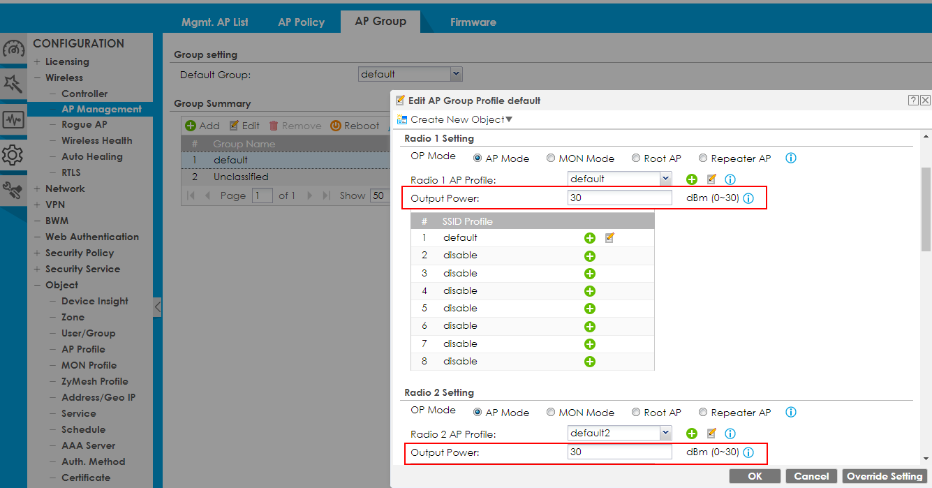 前往 Configure -> Wireless -> AP Management -> AP Group -> Edit AP Group