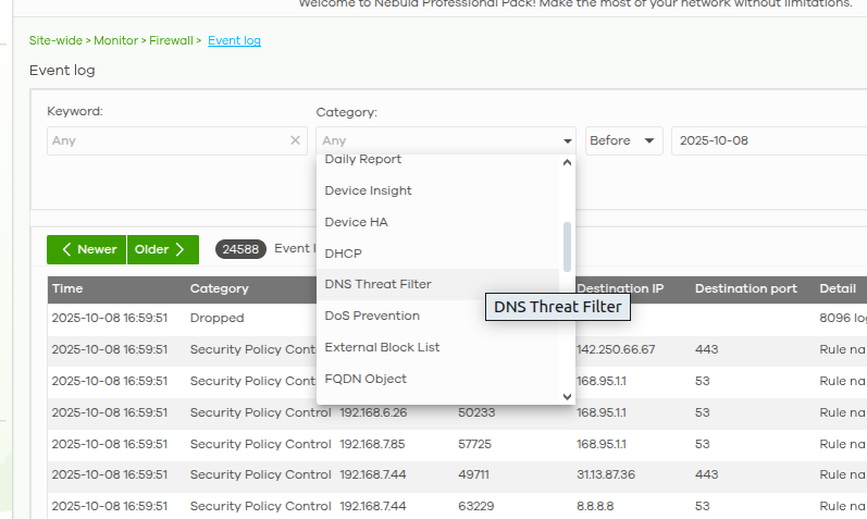 需要有網頁過濾 (DNS)功能。已開啟Elite Pack https://www.zyxel.com/tw/zh/elite-pack 30天試用。請問https://nebula.zyxel.com/平台上那裡看出網頁過濾 (DNS)功能已開啟?哪裡看已經封鎖了時麼網站?