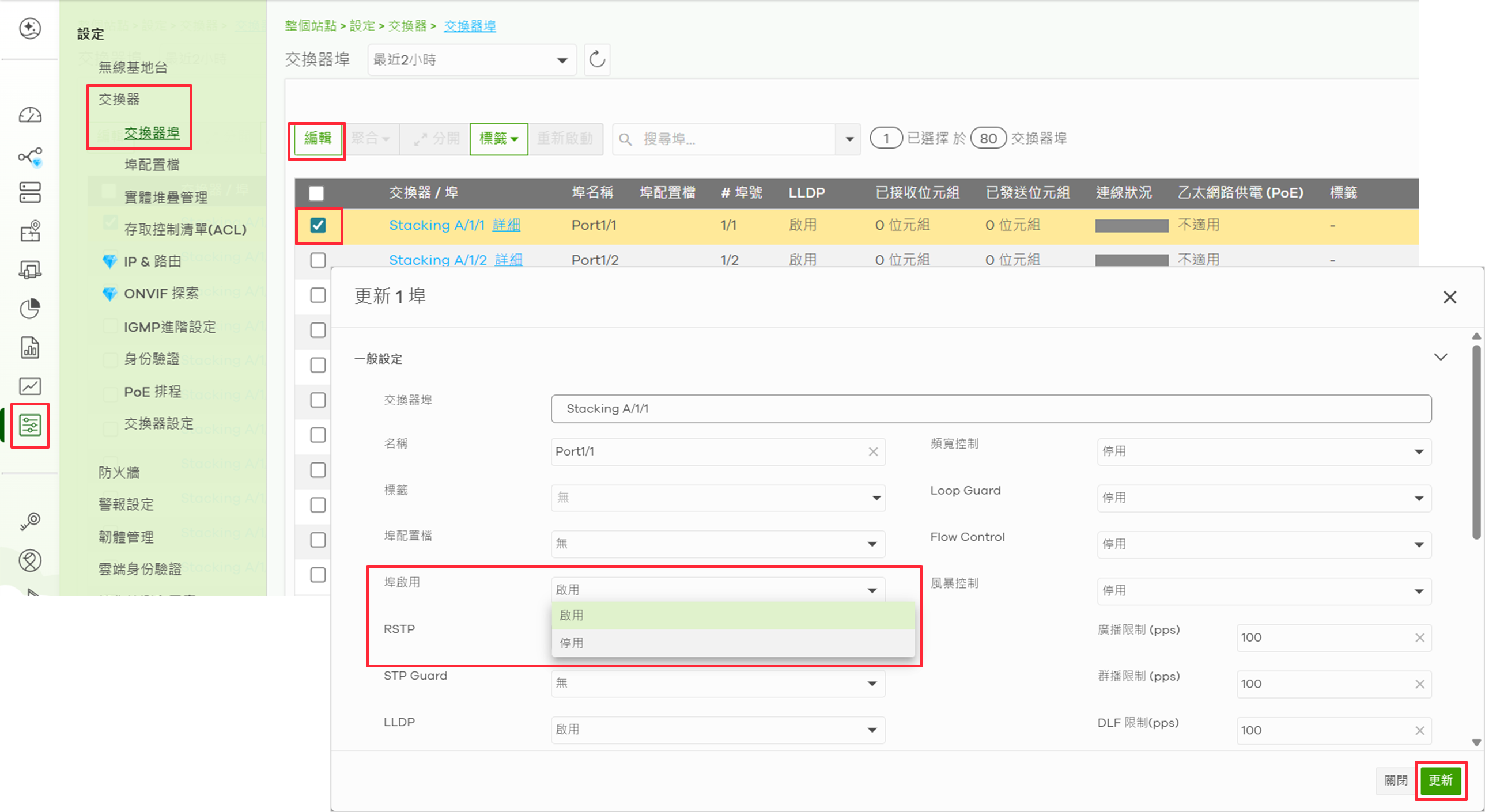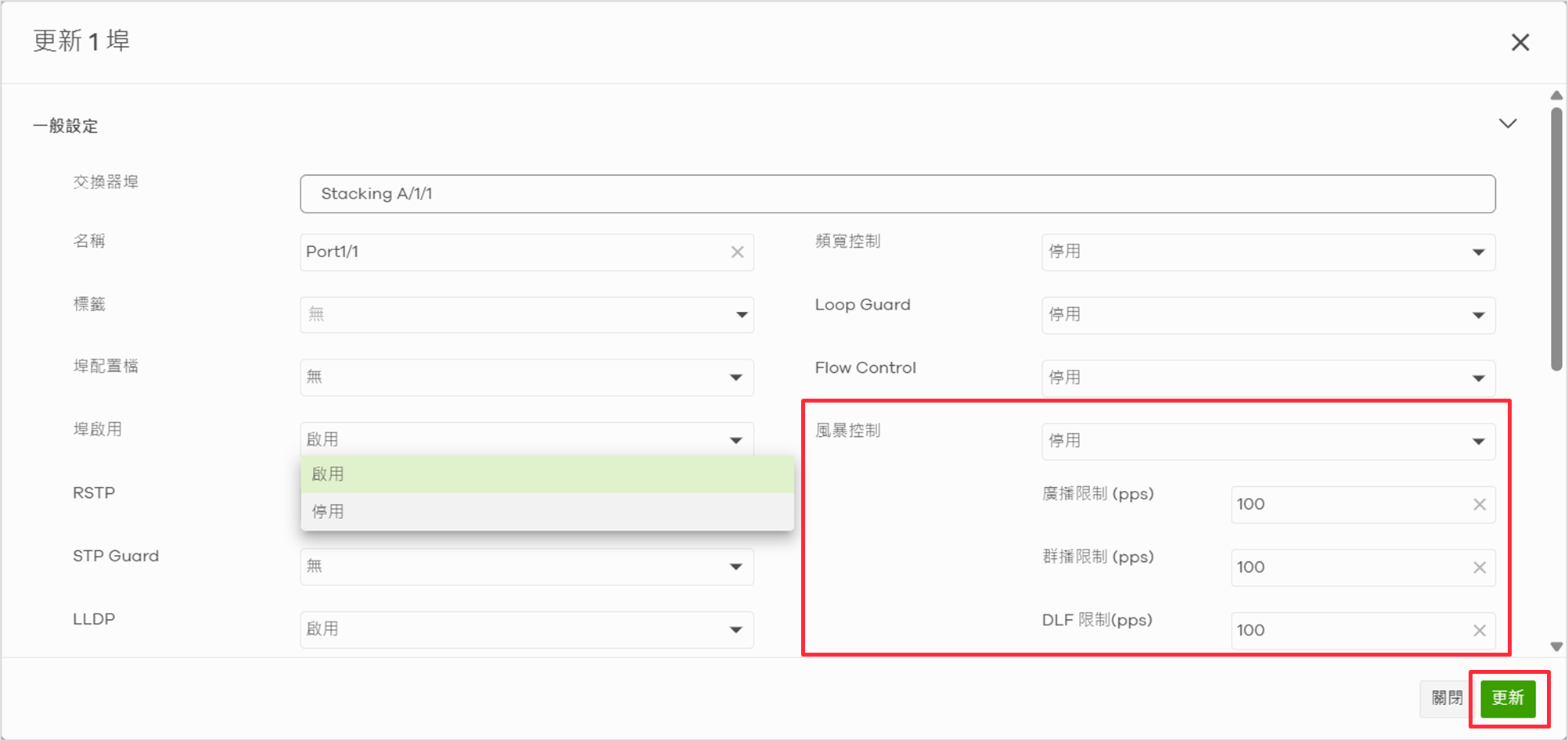 - ⚠️ 重要提醒:請勿在「串接交換器 (Uplink)」的連接埠啟用風暴控制!由於 Uplink 匯聚了大量設備的流量,限制廣播封包可能會導致正常的 ARP 或 DHCP 封包被丟棄,造成整段網路連線異常。請僅針對直接連接電腦或電話的 Port 設定即可。