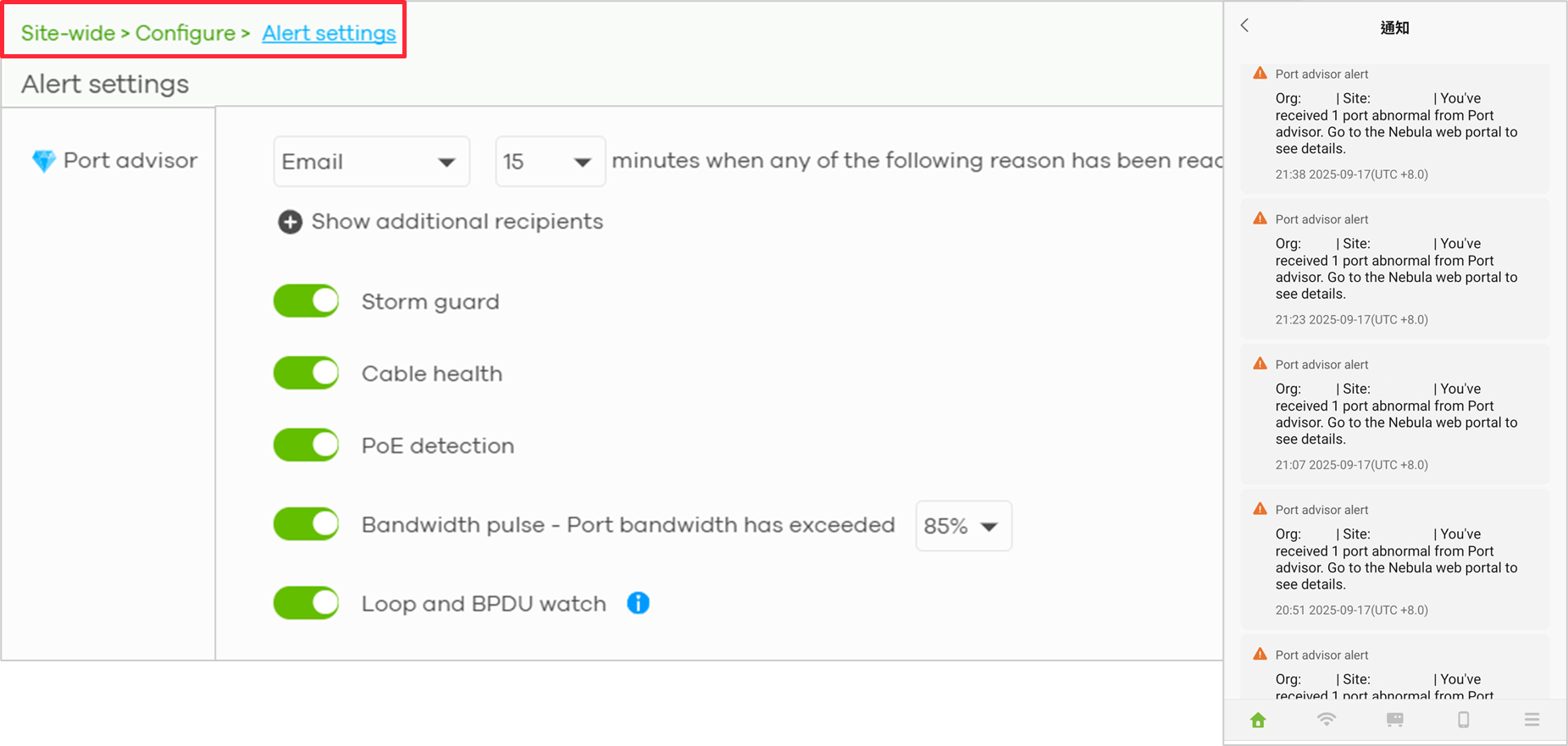 - 前往路徑:【組織】>【設定】>【警報設定】>【Port Advisor】