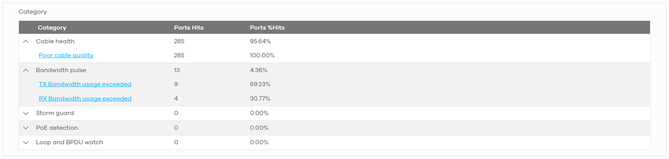 - 分類詳情:可展開每一類異常,查看受影響的交換器與埠口列表。