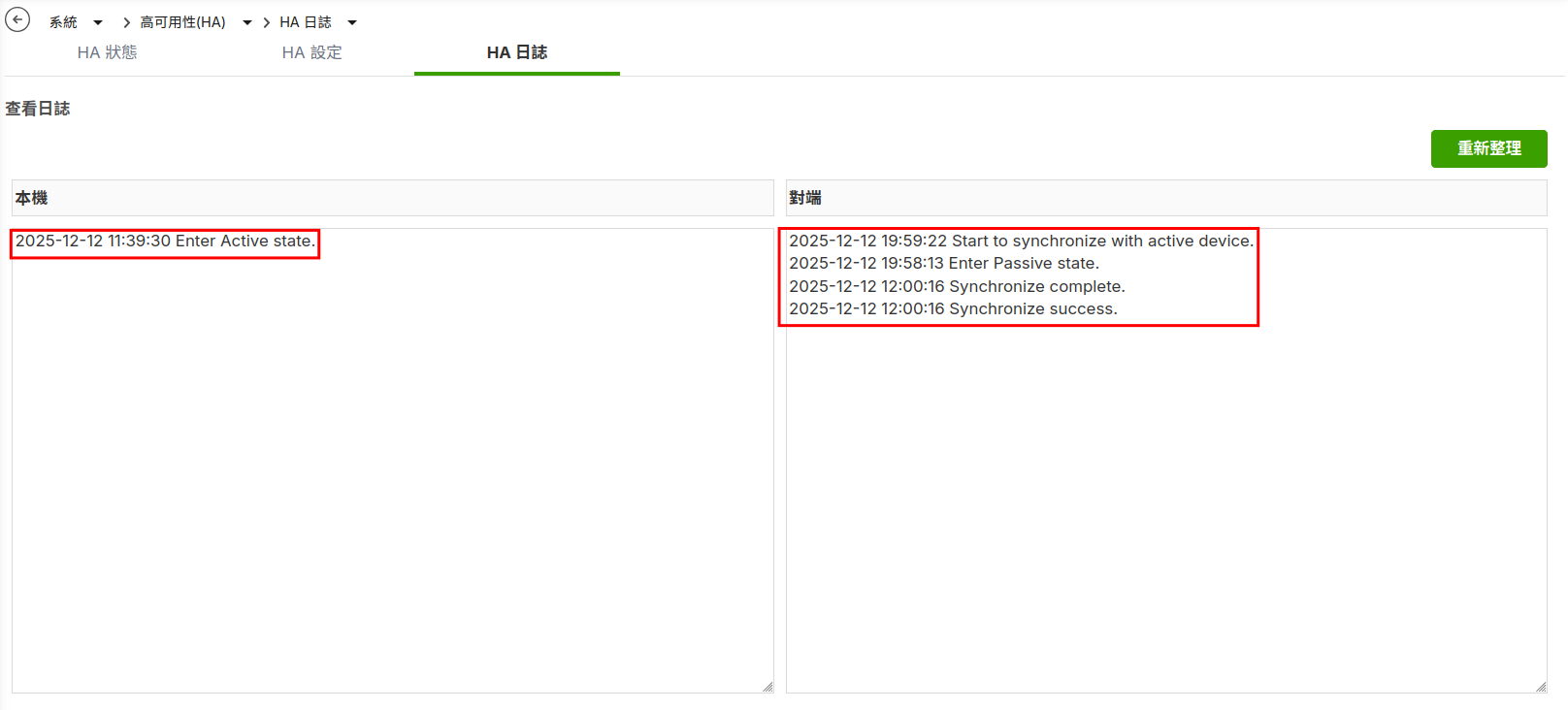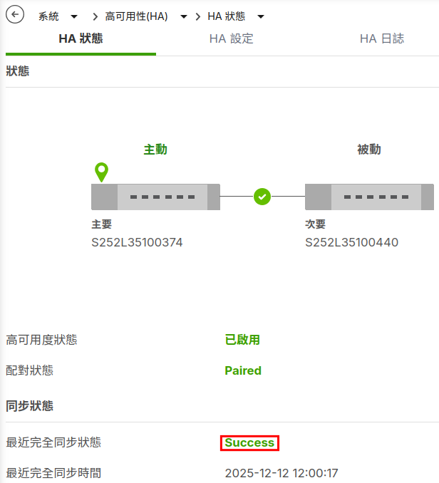 - 連到主動防火牆(Primary device),在“系統”>“高可用性(HA)”>“HA 狀態”,當最近完全同步狀態顯示 "Success"表示兩台防火牆已同步完成