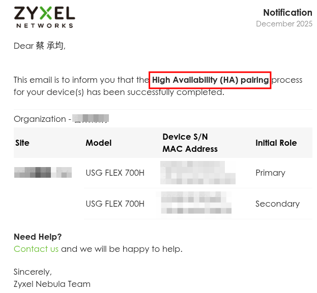 - 完成後會收到一封電子郵件通知,告知您的裝置已完成高可用性 (HA) 配對