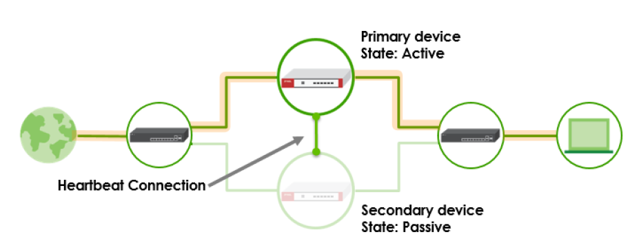 設備高可用性採用雙防火牆架構來確保網路連線的穩定,在正常情況下主動防火牆(Primary device)負責處理網路流量,而被動防火牆(Secondary device)則保持待命狀態。一旦主防火牆(Primary device)發生異常被動防火牆(Secondary device)會在數秒內自動接管主防火牆的功能,從而最大限度地減少網路中斷以維持網路的正常運作。