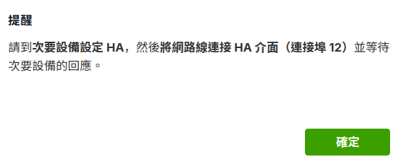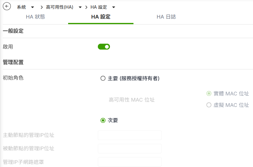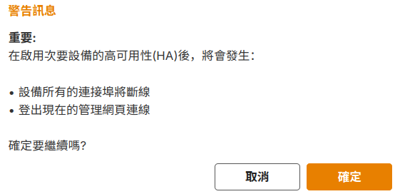 - 在“系統”>“高可用性(HA)”>“HA 設定”選擇次要後按套用 。