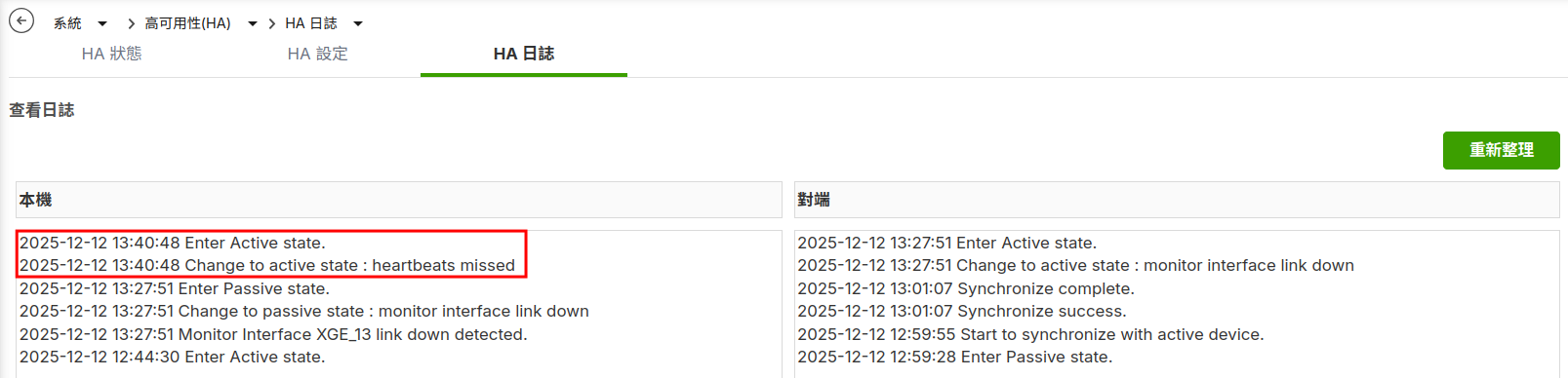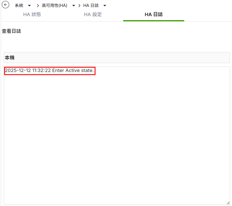 - 在“系統”>“高可用性(HA)”>“HA 日誌”中查看防火牆 HA 日誌。
