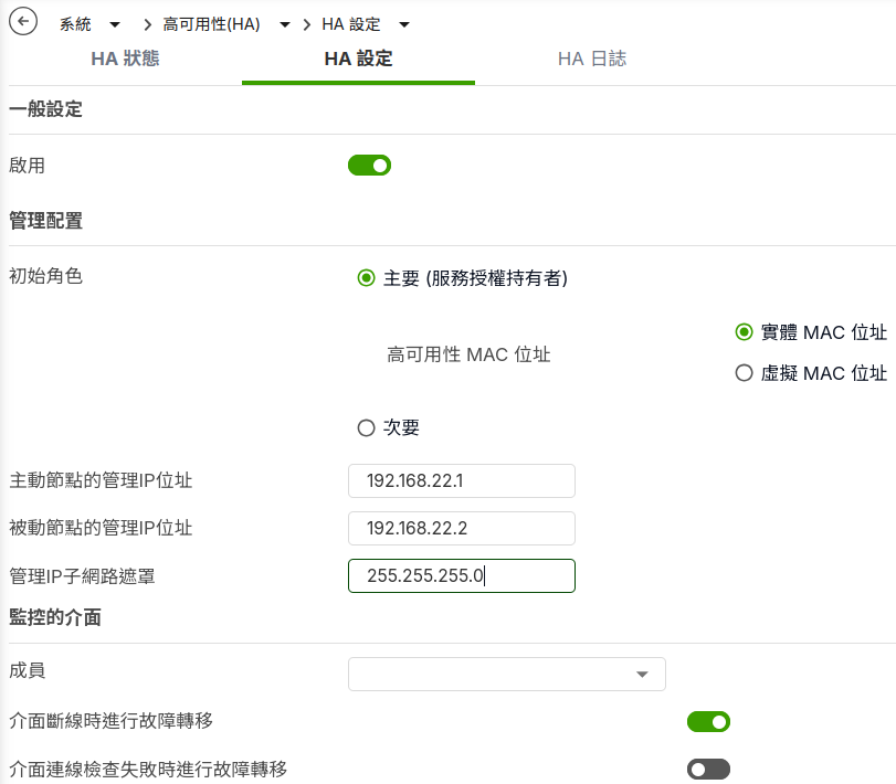 - 虛擬 MAC 位址:當防火牆角色切換時,備用防火牆會採用與主防火牆相同的虛擬MAC位址以減少網路連線中斷時間。