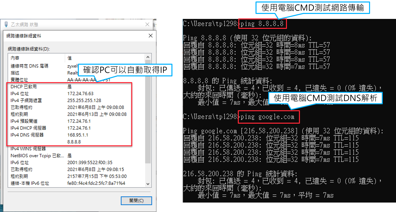 - [ ] 物理連線: 網路線接至 PC 是否可正常上網?