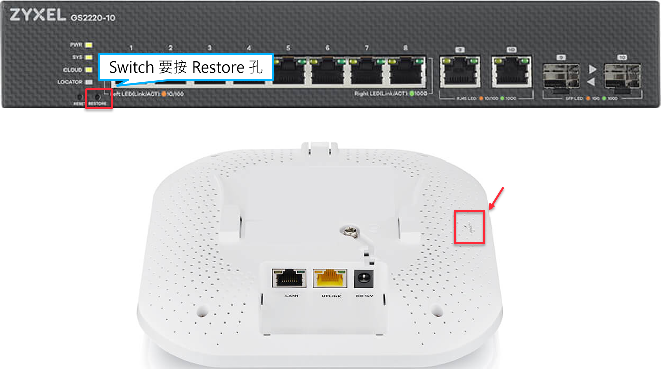- 注意事項: Switch 設備必須確保持續按壓 Restore 孔超過 10 秒,方能成功觸發恢復原廠預設值程序。